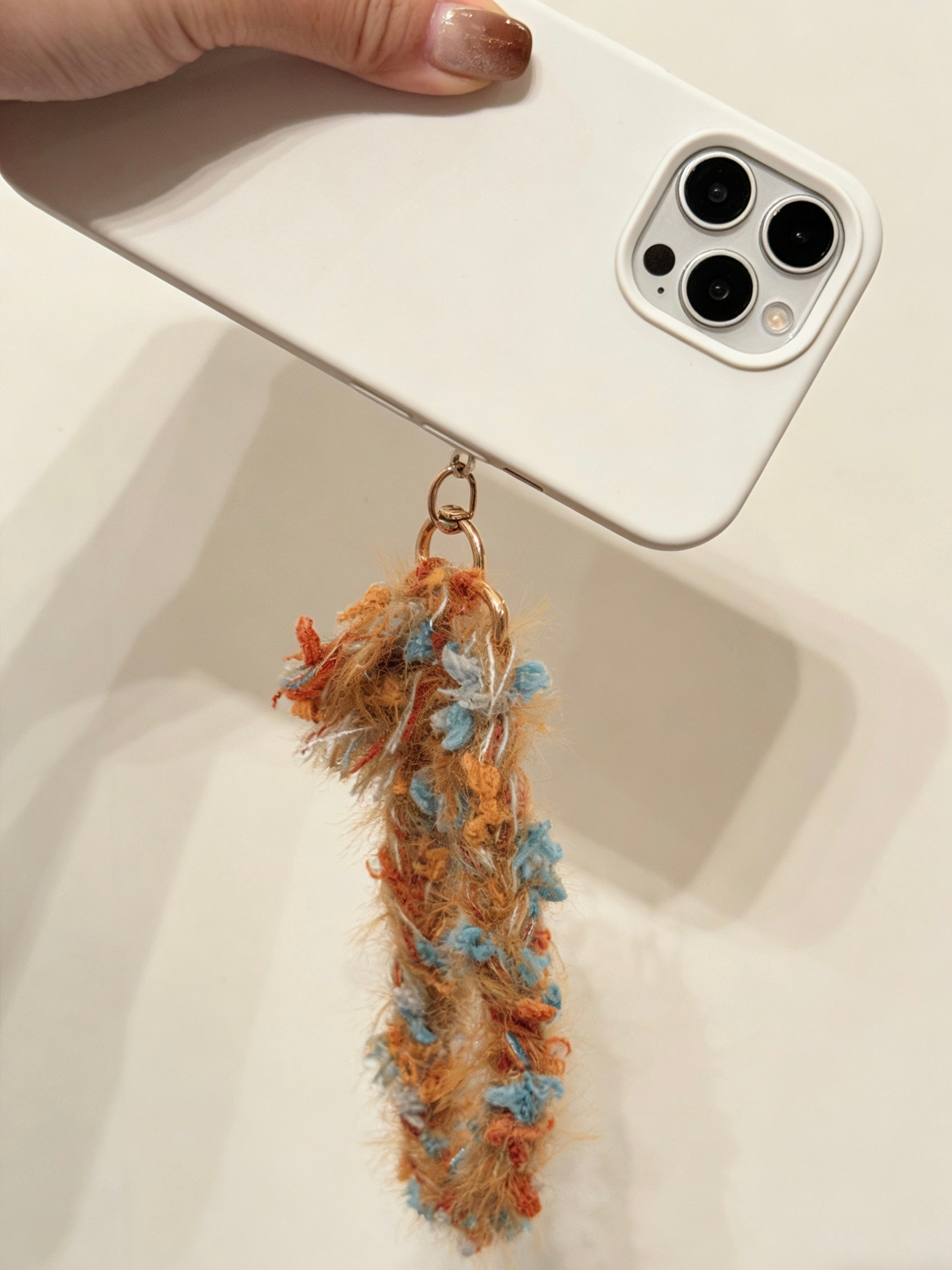 A beautifully textured knitted phone strap that adds charm to your everyday style.
