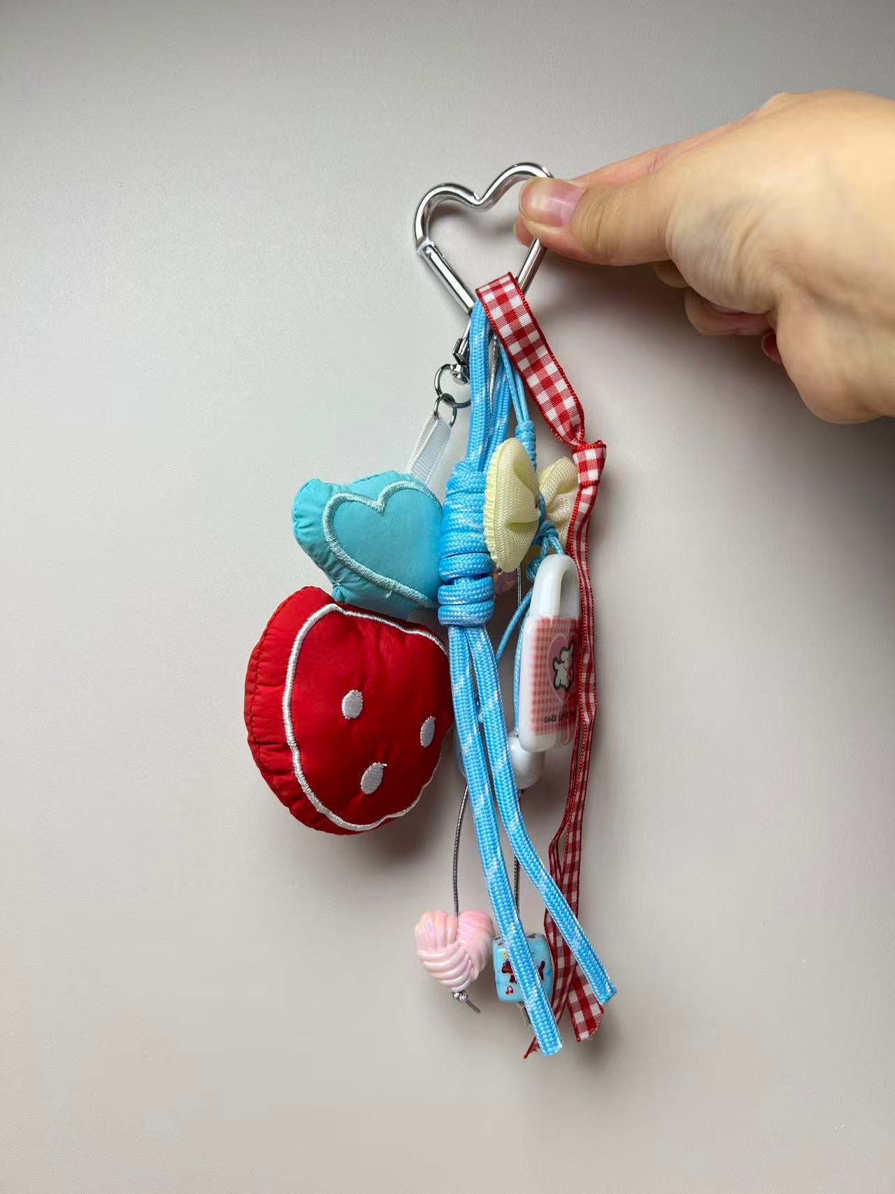 This bag charm features a vibrant sky blue and energetic red as its main colors, adorned with a mix of cute elements like strawberries, hearts, bows, and stars. Bursting with playfulness and vitality, it embodies a sweet and cheerful style. It's a perfect match for students and anyone with a love for adorable aesthetics.