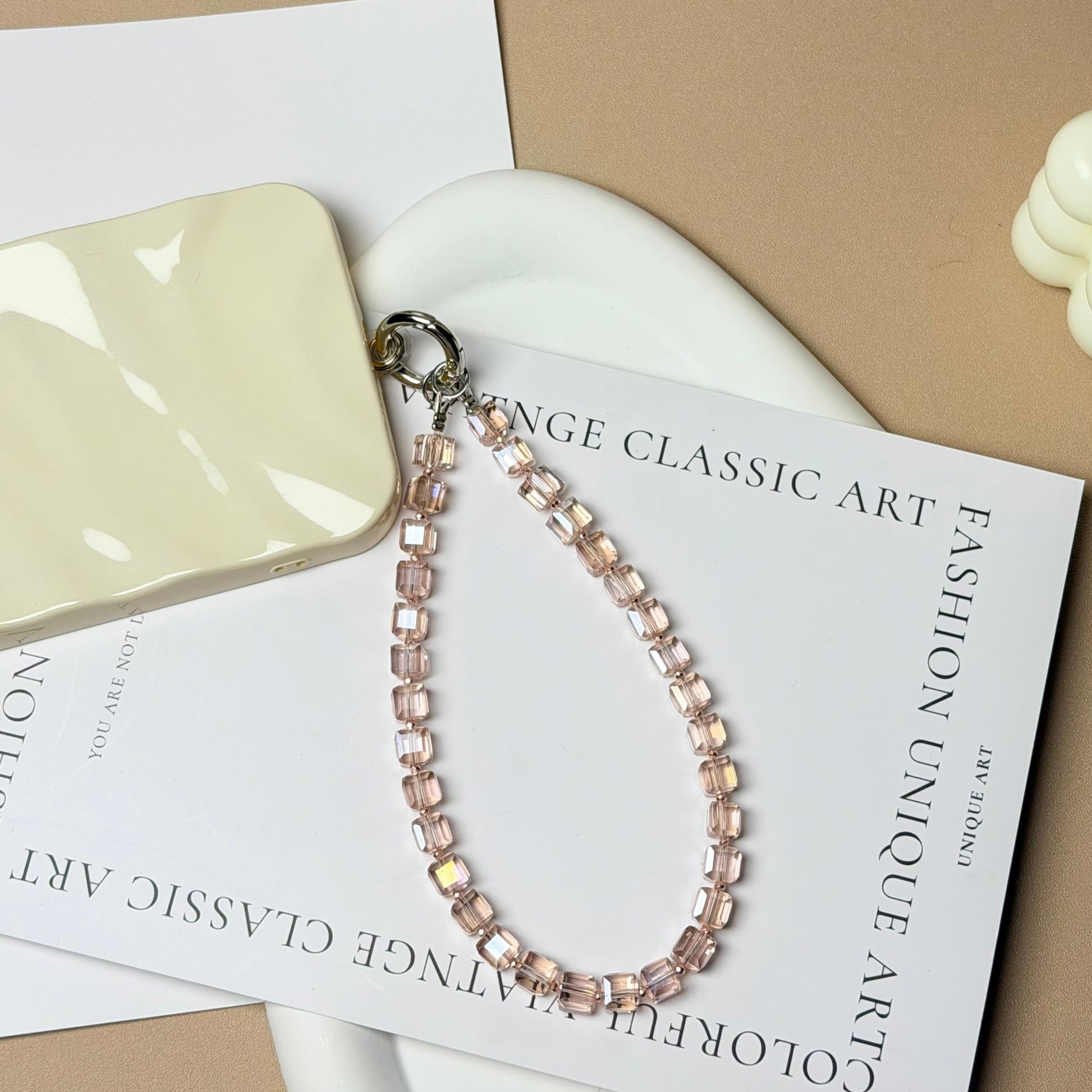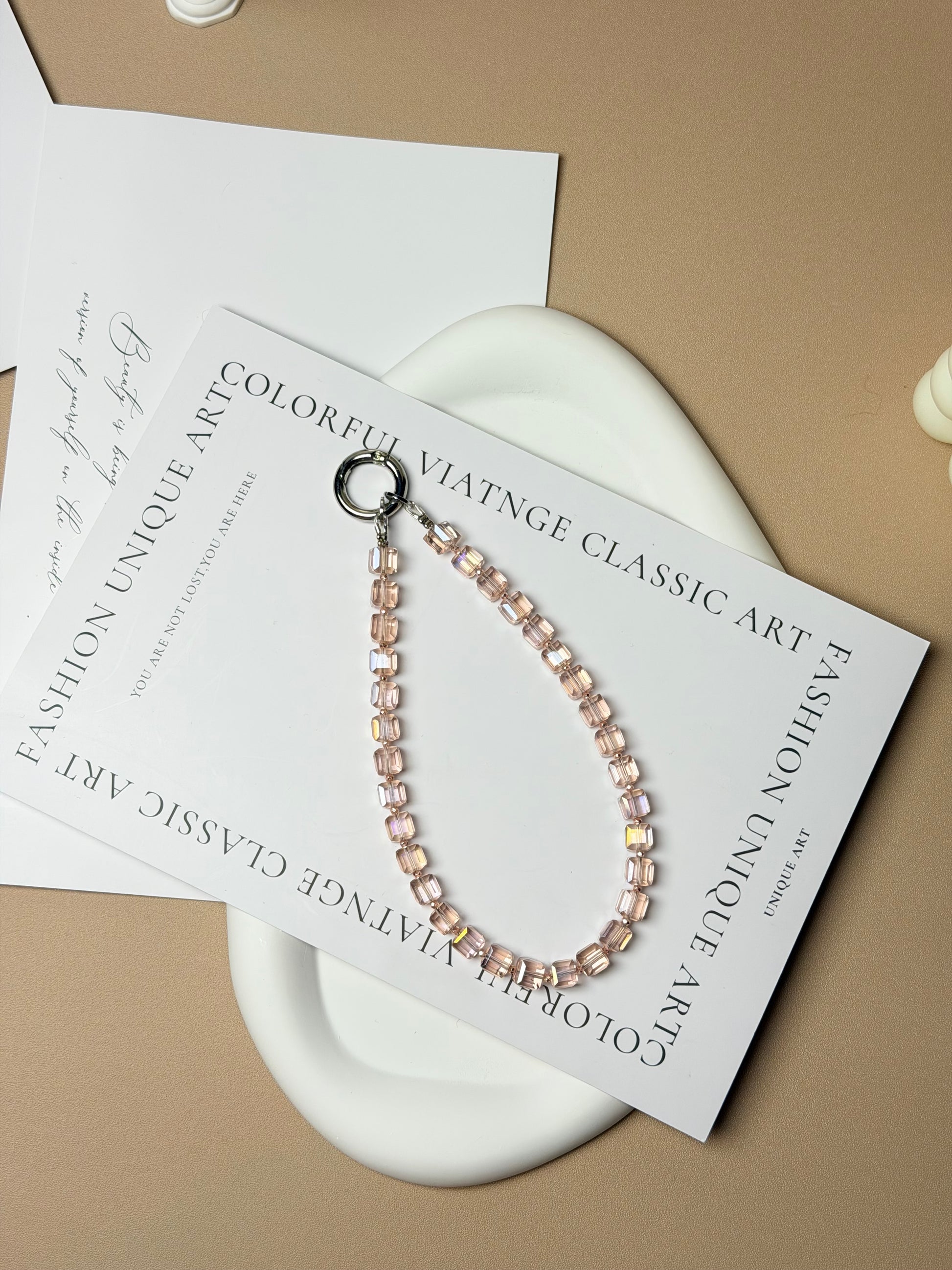 This phone charm is crafted from pink-colored transparent cubic beads, which create a delicate and soft refraction effect under light—subtle yet unmistakably present. The overall color palette is gentle and clean, making it perfectly suited for everyday commutes and minimalist outfits.